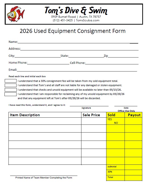 CLICK HERE to access our consignment form and for the details on how our consignment sale works or CLICK on the form, below! Let’s find your gear a new home—and help another diver make a splash!!